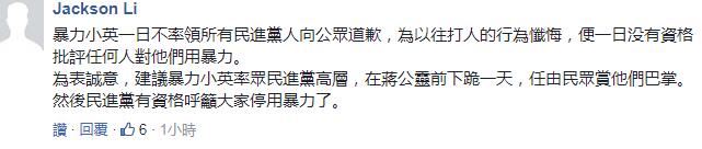 “從民進黨邱議瑩掌摑李慶華、管碧玲掌摑洪秀柱、蘇震清鎖喉陳宜民、黃偉哲砸傷吳育升、林淑芬砸傷吳成典、王定宇推倒張銘清等事中,蔡英文便已獲得‘暴力小英’的稱號”,新黨籍臺北市議員侯漢廷,在民進黨團聯手全力譴責暴力時,狠狠打臉對方,“他們以為,暴力應是民進黨的專利”!