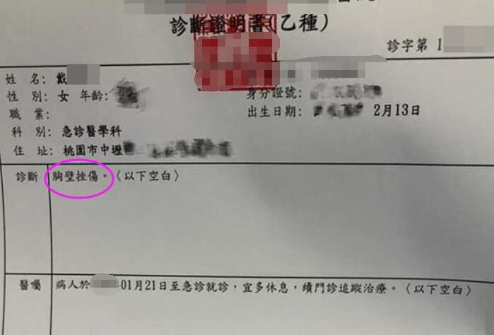 戴女表示,她當下也因胸口疼痛、呼吸困難掛急診,這才檢查出胸骨錯位、挫傷等,并請醫師開出驗傷單;廠商之后也致電說要包小紅包道歉,“當下我以為是這位主持人要包紅包給我,所以才想說,對方既然有誠意要道歉,那就算了”。
