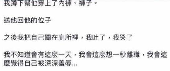 接著該男子又指著幫忙脫褲子的女空服員說“幫我拉內褲和褲子”,當時腦筋空白的該空服員,渾渾噩噩的完成后便將他送回位置,接著就躲進廁所哭泣、嘔吐,“不知道會有這么一天,這么想一秒離職”……