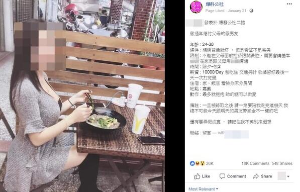 日前島內臉譜網的爆系社團以及“靠北虎科”、“靠北清大”等版面都出現大量類似的征友文,內容提到“征過年應付父母的假男友”,條件包含24-30歲,相貌普通就好,在除夕到初二期間陪征友回家,一天可領1萬元還包吃住……其中最特別的是:要不要一起睡需“看臉”,動作“最多抱抱”,但如果“帥的話可以愛愛”。