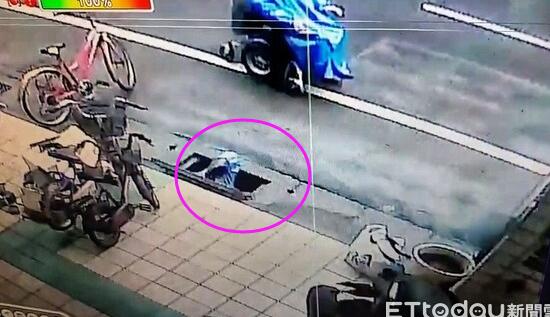 據附近店家的監視器顯示,楊男起先探頭找尋,接著伸進雙手,后來身體便失去重心,雙腳先卡在上方,最后整個人便倒栽蔥的掉了進去,再看不見人影了!