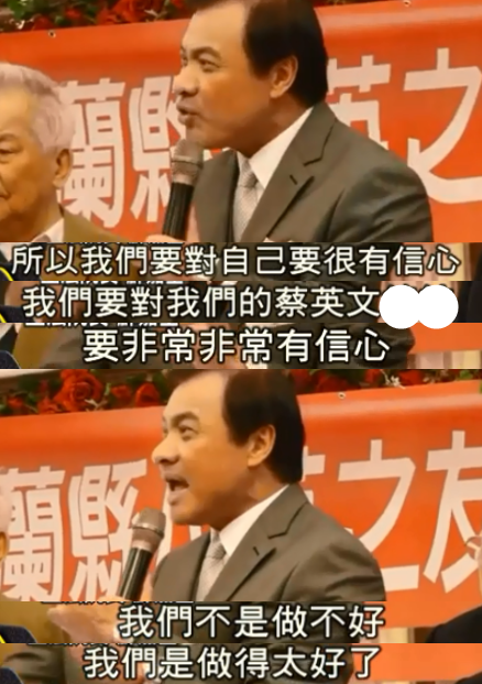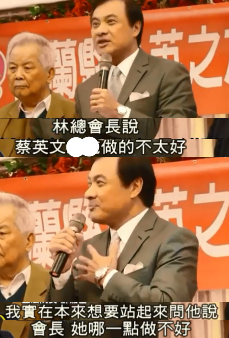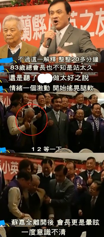字字鏗鏘、句句深情、聲情并茂、手舞足蹈,蘇嘉全吹起蔡英文來(lái),簡(jiǎn)直剎不住車。本來(lái)想站在蘇身邊走個(gè)過(guò)場(chǎng)的林金超,硬是足足聽了蘇嘉全20多分鐘的激情演講,終于在合影時(shí),體力不支,暈過(guò)去了。