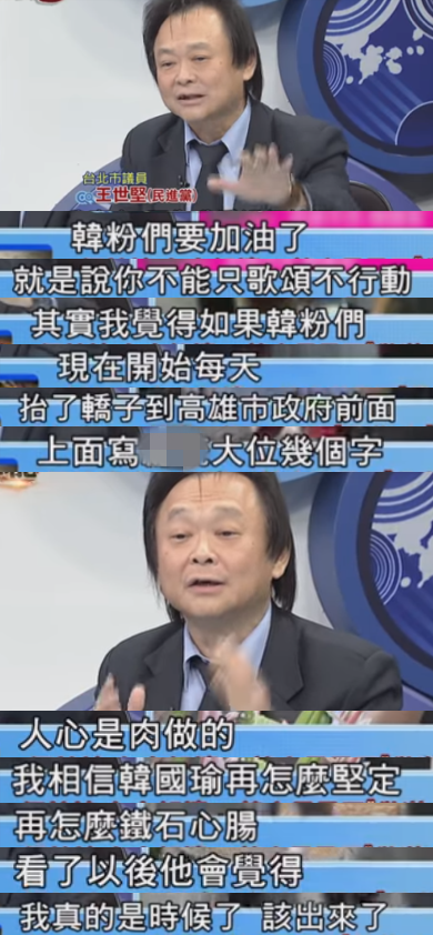 王世堅(jiān)呼吁,“韓粉”們不要只動(dòng)口不動(dòng)手,要抬著轎子,天天去高雄市政府門(mén)前求韓國(guó)瑜站出來(lái),這樣就會(huì)感動(dòng)韓國(guó)瑜。