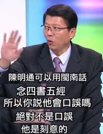 前臺南議員謝龍介表示,陳明通可是能用閩南語講四書五經的人,他是不會口誤的,說出這樣的話,顯然是刻意為之。