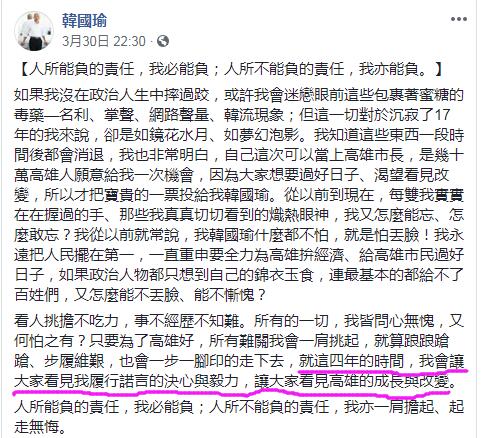 這里【插播】一則小消息:韓國瑜在接受質(zhì)詢的前二天,曾在網(wǎng)上發(fā)了篇“小作文”,其中的一句話,引起了各方的不同解讀:“就這四年的時間,我會讓大家看見我履行諾言的決心與毅力,讓大家看見高雄的成長與改變”。