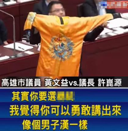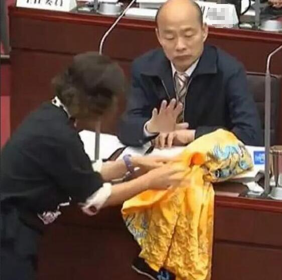 民進黨議員黃文義“先聲奪人”的表示,韓國瑜若想選2020,就該“像個男子漢一樣”,不要扭捏;接著按原劇本的發(fā)展,自顧自得為韓下定語——“你在等黃袍加身吧”。說罷,令人吃驚的一幕發(fā)生了:他與另一議員李喬如一起,拿出了一件繡著“龍紋”的黃袍,在韓國瑜面前展開,李更是雙手為韓國瑜“奉上大禮”!