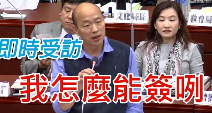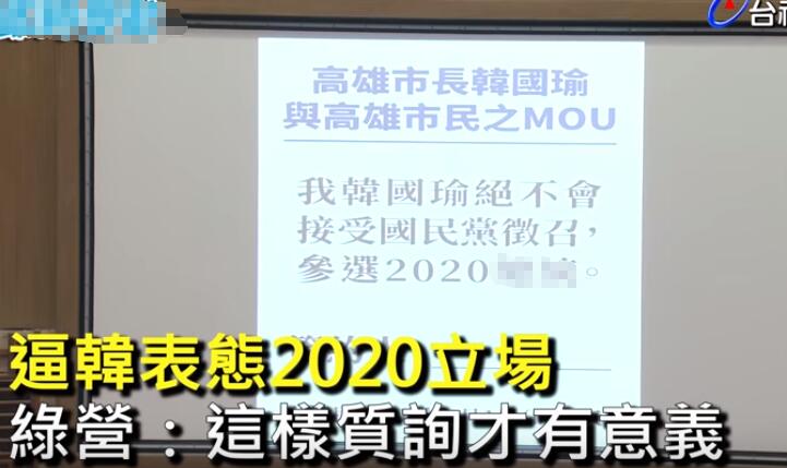 在2日的議會質(zhì)詢時,更變本加厲的讓韓國瑜“簽字畫押”:要求身為市長的韓國瑜簽下一張與市民的備忘錄(MOU),內(nèi)容為——“韓國瑜絕不接受國民黨征召,參選2020”。