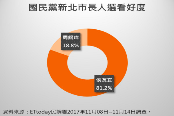 新北市長部分,現(xiàn)任副市長侯友宜以(81.2%)看好度遙遙領先前臺北縣長周錫瑋(18.8%),且不論在哪個年齡層的族群都大幅領先,有望成功保下新北。