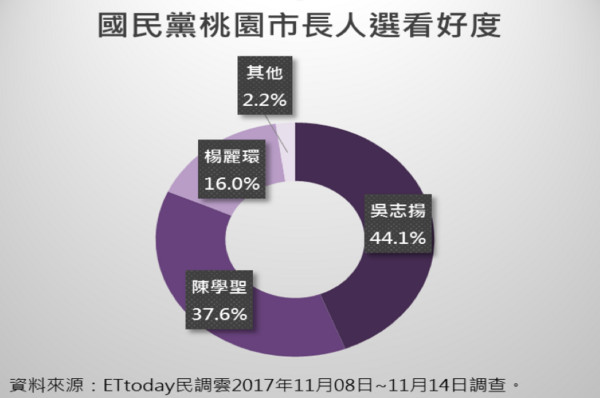 桃園市長方面,吳志揚曾任桃園縣長,2014年代表國民黨參選桃園市長時,敗給民進黨陣營的鄭文燦。據(jù)臺灣“中時電子報”報道,桃園市議會9月份進行2018桃園市長問卷調查,了解選前1年民眾對于桃園市長人選的意見,共發(fā)出1萬份抽樣。7位可能參與桃園市長人選,暫以吳志揚、陳學圣、魯明哲領先,吳志揚為現(xiàn)任“立委”也是前任縣長。選民認為吳與鄭文燦競選的機率較高。