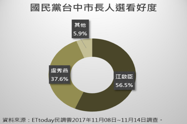 在競爭對手部分,盧秀燕的民調支持度暫時領先江啟臣8%;但在看好度部分,江啟臣則是略高盧秀燕約2%。學經歷部分,有52%民眾認為江啟臣比較符合市民對市長身份的期待,盧秀燕則只有34.51%。在競選對戰(zhàn)支持度部分,江啟臣以46.3%,勝過林佳龍的30.37%,盧秀燕則以46.43%勝過林佳龍的29.71%。