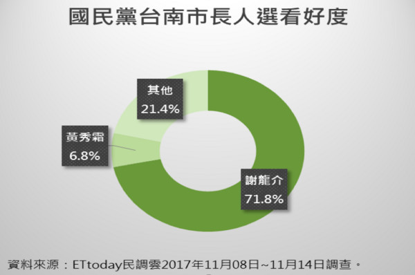 臺南市候選人中,現(xiàn)任市議員謝龍介(71.8%)受網友看好,上屆參選落敗的黃秀霜看好度僅6.8%。交叉分析顯示,謝龍介不論在哪個族群的看好度都大幅領先黃秀霜。