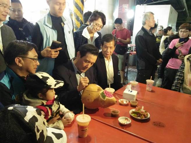 馬英九跨年夜到六合夜巿喝木瓜牛奶,并為民眾簽名。(圖片來源:臺灣《中時電子報》)