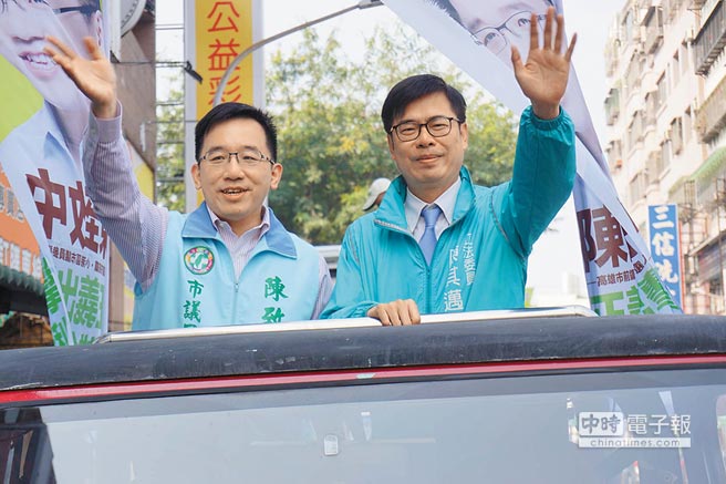 “綠委”陳其邁(右)17日為陳致中(左)掃街拜票。(圖片來(lái)源:臺(tái)灣《中時(shí)電子報(bào)》)