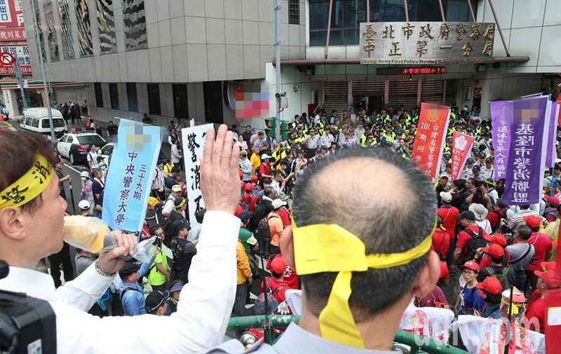 退休警消反年改團(tuán)體,24日持續(xù)上街頭,在“立法院”中山南路周邊集結(jié)游行抗議。(圖片來源:臺灣《聯(lián)合報(bào)》)