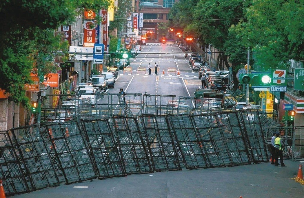 “立法院”外除了重重蛇籠外,警方還夜以繼日地在重要路口警戒。(圖片來源:臺灣《聯(lián)合報(bào)》)