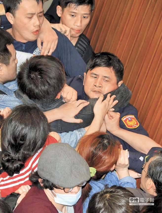 “太陽花學運”學生攻入“立法院”,拉扯攻擊駐守警察。(圖片來源:臺灣《中時電子報》)