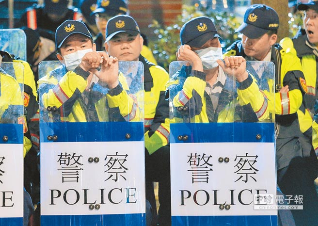 反年改團體“八百壯士”在“立法院”前抗爭,大批警力徹夜輪班戒備,疲累的警察只能靠著盾牌稍事休息。(圖片來源:臺灣《中時電子報》)