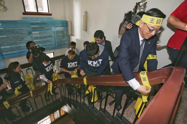 “藍委”沖入臺當局“教育部”綁黃絲帶。(圖片來源:臺灣《中時電子報》)