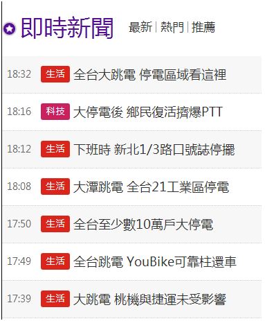 臺灣《中時電子報》關于“全臺大停電”的報道截圖(部分)。