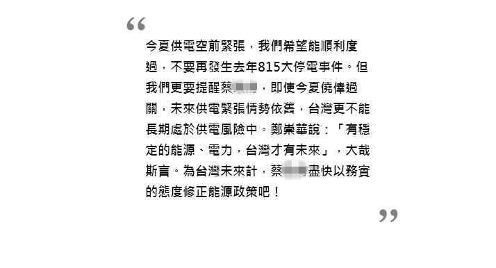 因此說明年之后就無缺電之虞,不只過度樂觀更已枉顧現實,F實狀況是:供電仍然吃緊,蔡當局必然要讓原本應除役的老舊電廠繼續運轉,臺中、高雄地方對電廠減煤兩成的要求也不能執行。但這么一來,全臺的空污與排放就難有改善的一天。蔡英文在接見環保團體時說“這10年是臺灣能源政策轉型最痛苦的10年”,其實更接近事實,也代表供電緊張會是長期問題。