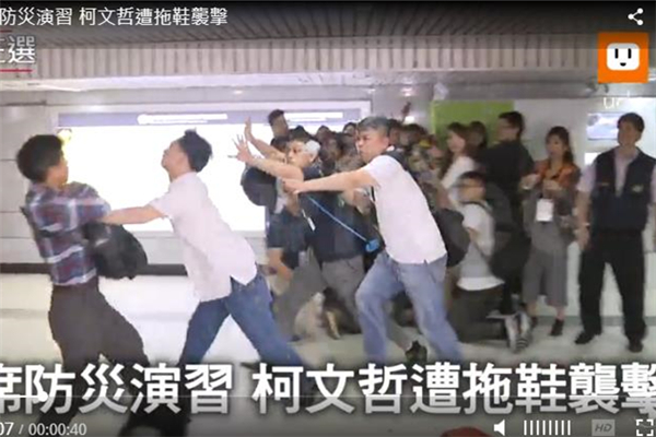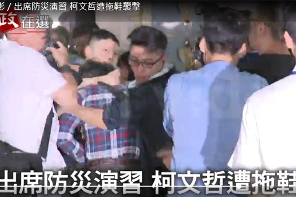 柯文哲出席防災(zāi)演習(xí)遭拖鞋襲擊,場(chǎng)面混亂。(圖片截取自臺(tái)灣《聯(lián)合報(bào)》)