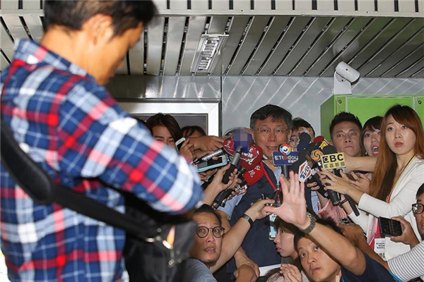 臺(tái)北市長(zhǎng)柯文哲(右四)在接受媒體采訪時(shí),有“臺(tái)獨(dú)”分子(左一)向其丟鞋。(圖片來(lái)源:臺(tái)灣《聯(lián)合報(bào)》)