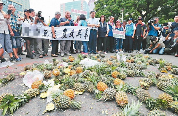 鳳梨價(jià)格慘跌,南投、云林、嘉義、高雄、屏東等縣市的農(nóng)民怒砸鳳梨抗議,果肉散落在“行政院”大門。(圖片來源:臺灣《聯(lián)合報(bào)》)