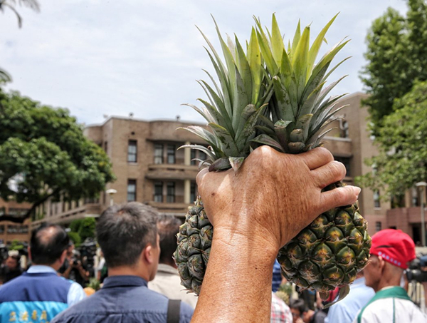 有農(nóng)民高舉鳳梨抗議,控訴臺當(dāng)局產(chǎn)銷管控不彰。(圖片來源:臺灣《聯(lián)合報(bào)》)