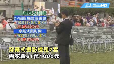據報道,1套10萬(新臺幣,下同)多的DV攝影云端視訊服務預計租借3套,共需花費32萬7000元。穿戴式攝影機每套8萬7288元要租7套,花費61萬1000元。其他網路傳輸設備加上電源擴充模組,總計需花費100萬元。