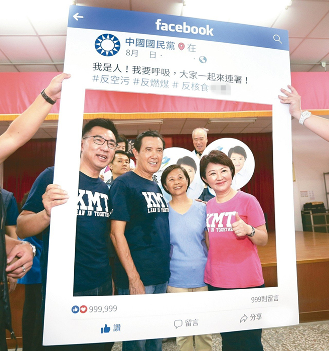 馬英九(左二)、國民黨臺中市長參選人盧秀燕(右)與“立委”江啟臣(左)簽署“反空污、反核食、反深澳電廠”“公投”聯(lián)署書并打卡合影。(圖片來源:臺灣《聯(lián)合報》)