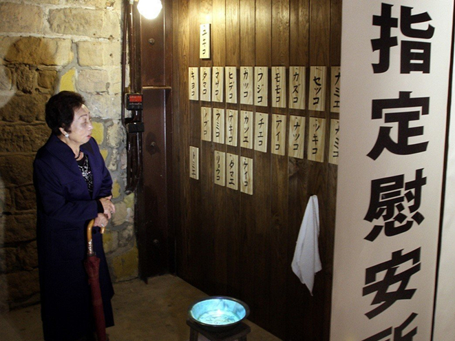陳蓮花阿嬤二次大戰(zhàn)期間遭拐騙成慰安婦,曾參觀“慰安婦展覽”,望著墻上掛著慰安婦名牌的模擬慰安所。(圖片來源:臺灣《聯(lián)合報》)