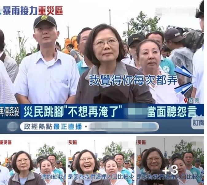 25日,在暴雨發生后的第三天,蔡英文終于出面勘災。與眾人想象中的畫面不同,蔡英文的出場方式讓災民憤怒不已。