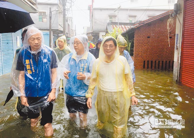 國民黨高雄市長參選人韓國瑜(左)到探視淹水災情。(圖片來源:臺灣“中時電子報”)