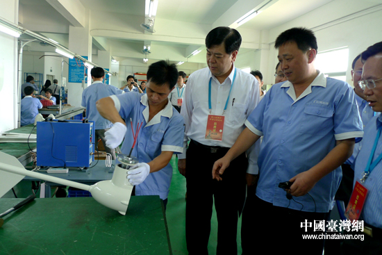 參加第六屆兩岸經貿文化論壇的新能源組參訪團代表9日來到廣州紅鷹能源科技有限公司參訪(中國臺灣網 李徽 攝)