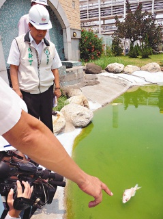臺塑六輕大火后,5日首度開放讓議員及縣府官員進廠。臺塑人員努力解說污水處理后的水質可以養魚,但全池只有一條魚,而且還是死魚。 圖片來源:臺灣《聯合報》