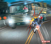 中國臺灣網11月30日消息 臺北縣一名在卡拉OK店打工的離婚女子,昨下班搭乘一名酒客的摩托車離去,未料摩托車行經貢寮濱海公路一處彎道,卻失控沖至對向車道,與一輛砂石車擦撞,女子當場遭砂石車輾成三截慘死,醉酒男子也重傷昏迷。
