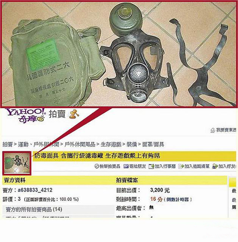 據臺灣媒體報道,臺灣網友爆料指出,因日本核災,他原想在Yahoo!拍賣網站搜尋防毒面具,欲采購寄送日本友人,卻看到臺軍制式裝備防毒面具在網絡上拍賣,一名署名“a638833-4212”的賣家,拍賣臺軍制式防毒面具,甚至吹噓戴上這種防毒面具玩生存游戲,“有夠屌”。賣家除賣防毒面具外,還出售攜行袋及濾毒罐,共3200元新臺幣。