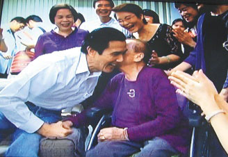 馬英九探視屏東102歲人瑞劉成妹,劉成妹對(duì)馬英九說(shuō)“你給我愛(ài)一次!”馬英九親了阿婆臉頰,還獻(xiàn)唱兒歌“妹妹背著洋娃娃”,阿婆開(kāi)心地說(shuō):“看到你我真的好福氣!”(圖片來(lái)源:聯(lián)合報(bào))