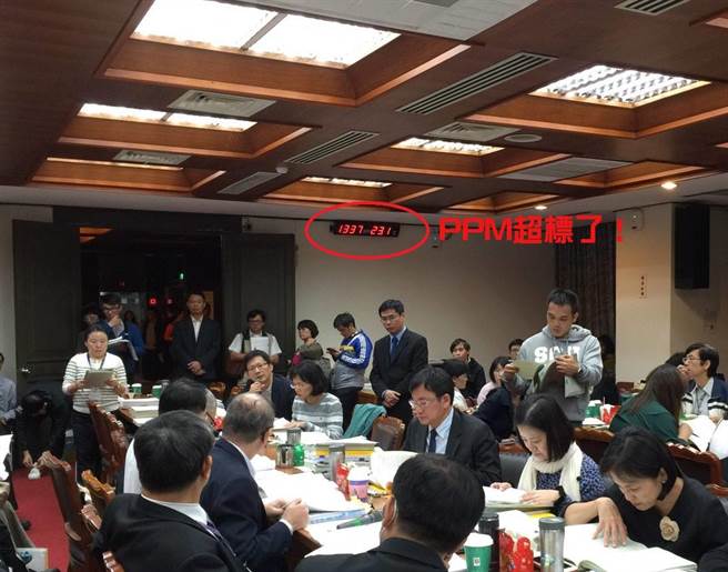 她公布“立院教育文化委員會”開會時的紀錄顯示,一群人悶在會議室里討論,不知不覺間空氣中的二氧化碳濃度便沖1300PPM。而根據“環保署”公布的數據,室內二氧化碳濃度達700PPM時,就會感覺空氣污濁與引起不舒適感,達到1000PPM以上時,則會令人感到困頓疲倦。