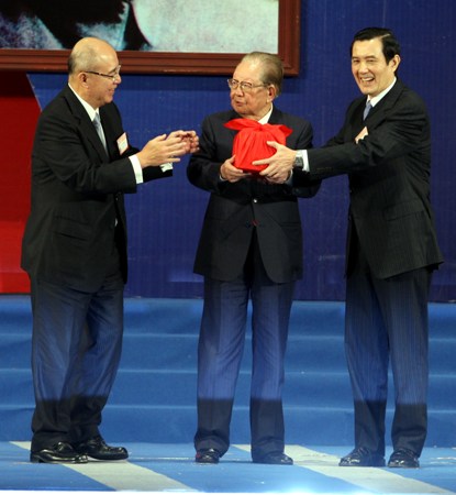 馬英九從吳伯雄手中接過黨主席印信。(圖片來源 臺灣“中央社”)