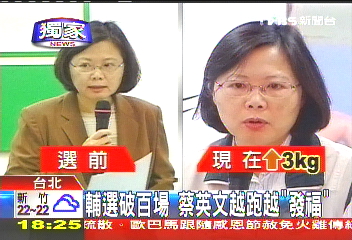 中國(guó)臺(tái)灣網(wǎng)11月26日消息 島內(nèi)“三合一”選舉進(jìn)入最后沖刺階段,民進(jìn)黨提名的候選人有的似“煙燻縮水”,有的像“烤焦脫水”,體重是紛紛下降。不過(guò)有個(gè)人體重卻“逆勢(shì)成長(zhǎng)”,民進(jìn)黨主席蔡英文輔選跑透透,一個(gè)月行程破百場(chǎng),卻可以“心寬體胖”,增加3公斤。