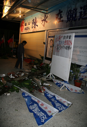 許敬民駕車撞陳水在競(jìng)選總部時(shí),總部鐵卷門已經(jīng)拉下,內(nèi)部無(wú)人,但將鐵卷門撞凹,門外的旗幟撞得東倒西歪,盆栽破碎一地。
