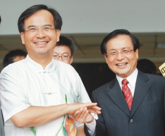 大臺南選戰,臺南縣長蘇煥智(左)今開第一槍宣布參選,臺南市長許添財(右)的進場式也演練好了,日后不容易看到這樣的哥倆好了。臺灣《聯合報》資料照片