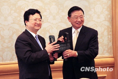 3月1日中午,海基會(huì)董事長(zhǎng)江丙坤(右)在臺(tái)北西華飯店會(huì)見(jiàn)并宴請(qǐng)陜西省副省長(zhǎng)景俊海(左)一行。景俊海此次臺(tái)灣之行是為今年下半年陜西省長(zhǎng)袁純清率團(tuán)訪問(wèn)臺(tái)灣做前期準(zhǔn)備。圖為景俊海在宴會(huì)前向江丙坤贈(zèng)送禮品青銅鼎。 中新社發(fā) 耿軍 攝