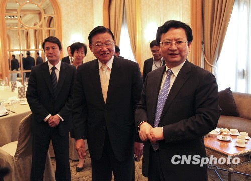 3月1日中午,海基會(huì)董事長(zhǎng)江丙坤(右二)在臺(tái)北西華飯店會(huì)見(jiàn)并宴請(qǐng)陜西省副省長(zhǎng)景俊海(右一)一行。景俊海此次臺(tái)灣之行是為今年下半年陜西省長(zhǎng)袁純清率團(tuán)訪問(wèn)臺(tái)灣做前期準(zhǔn)備。 中新社發(fā) 耿軍 攝