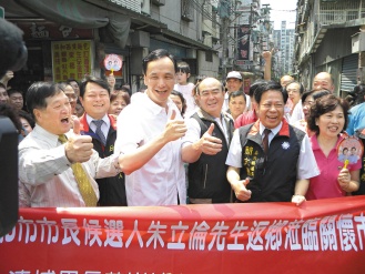 臺當局前“行政院副院長”朱立倫(前排左二)投入新北市長選舉,昨天到中和市與鄉(xiāng)親博感情,受到當?shù)孛癖姛崃覛g迎。圖片來源:臺灣《聯(lián)合報》