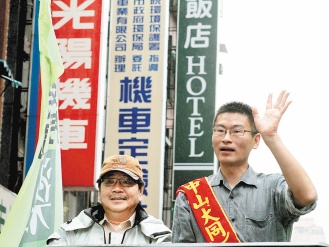 前民進黨秘書長吳乃仁29日上午陪同臺北市議員參選人梁文杰(右)拜票。(圖片來源:臺灣《聯合晚報》)