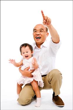 民進黨臺北市長提名人蘇貞昌利用空檔拍攝競選定裝照,他這波定裝照主打家庭溫馨牌,找來外孫女一起入鏡。圖片來源:臺灣自由時報