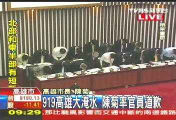 中國臺灣網(wǎng)9月28日消息 綜合臺灣媒體報(bào)道,針對“凡亞比”臺風(fēng)造成高雄大淹水,市長陳菊遭到相當(dāng)多指控,在今(28)日上午的高雄市議會(huì)總質(zhì)詢時(shí),陳菊特別率領(lǐng)高雄市府官員向市民鞠躬道歉。