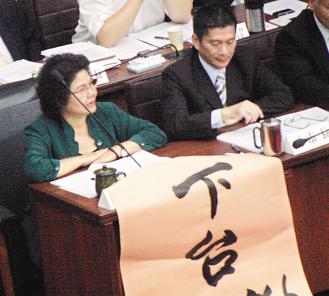高雄市議會(huì)29日上午進(jìn)行市政總質(zhì)詢,市議員梅再興在陳菊座位前貼上“下臺(tái)”海報(bào)。來源:臺(tái)灣《聯(lián)合報(bào)》